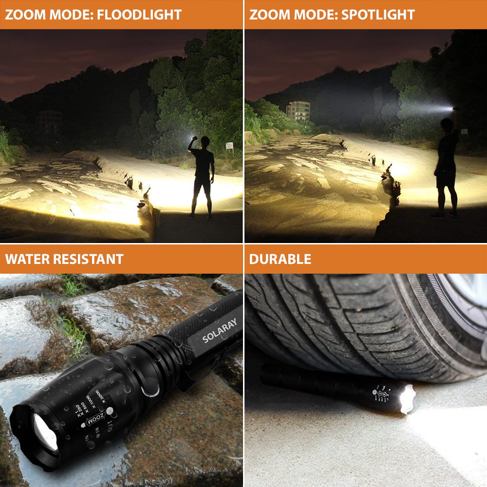 The ZX-1XL LED flashlight offers a zoom features which is great for many situations from hunting and camping to security work. The Adjustable Focus Zoom allows you to shine the light beam on a targeted area. It can even be something in the distance. You might need enhanced light on a moonless night to spot a deer or an critter in a tree. Security guards often need to see exactly what something is even in a dark warehouse. 5 Light Modes Five Preset Light Mode OptionsThe ZX-1XL 18650 LED Flashlight offers five different preset light modes (High, Medium, Low, Strobe and SOS). Want to change to a different light mode? It’s easy. Just quickly click on the tail-cap button. This is a must-have for those who like to go jogging in the evenings. This professional LED flashlight can be a lifesaver for individual self-defense. Of course, if you just need a simple flashlight on any project, use the medium or low beams. In S.O.S. mode, the flashlight will send out the international Morse code distress signal. When activated, the light beam flashes quickly three times, slowly three times, followed by three more fast flashes. The light flashing frequency is standard and the S.O.S light mode repeats itself when the light cycle completes.