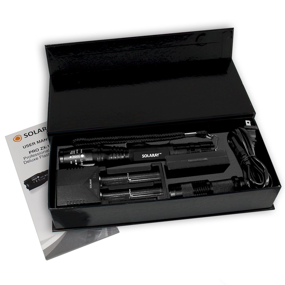 1 x ZX-1XL LED Tactical Flashlight 1 x Attached Lanyard (removable) 1 x Attached Belt Clip (removable) 1 x Rapid Battery Charger 2 x Rechargeable Batteries 1 x Storage Case for Batteries 1 x Mini EDC LED Flashlight (battery not included) 1 x User Manual
